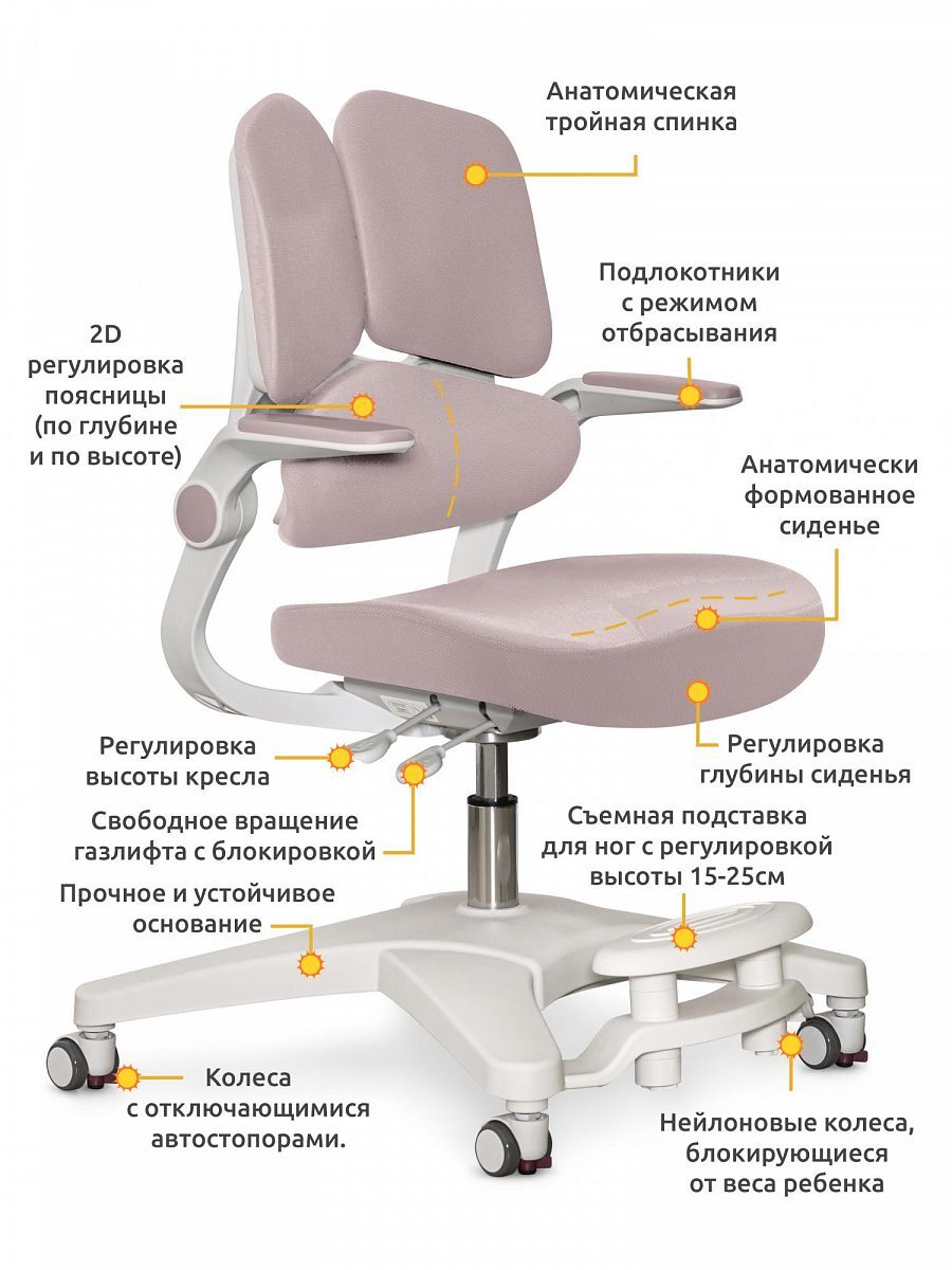 Тройная конструкция спинки позволяет идеально подстроить ее под рост и параметры ребенка и оказать максимальную поддержку каждому отделу позвоночника.