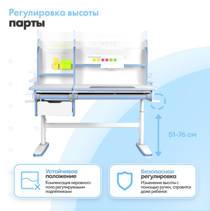 Тип регулировки высоты механический – по бокам парты расположены съёмные ручки-трещетки. Покрутив их по часовой стрелке, вы поднимете парту выше, а если начать крутить ручку против часовой стрелки, парта начнет опускаться вниз. Менять высоту парты очень легко, с таким занятием справится даже ребёнок.